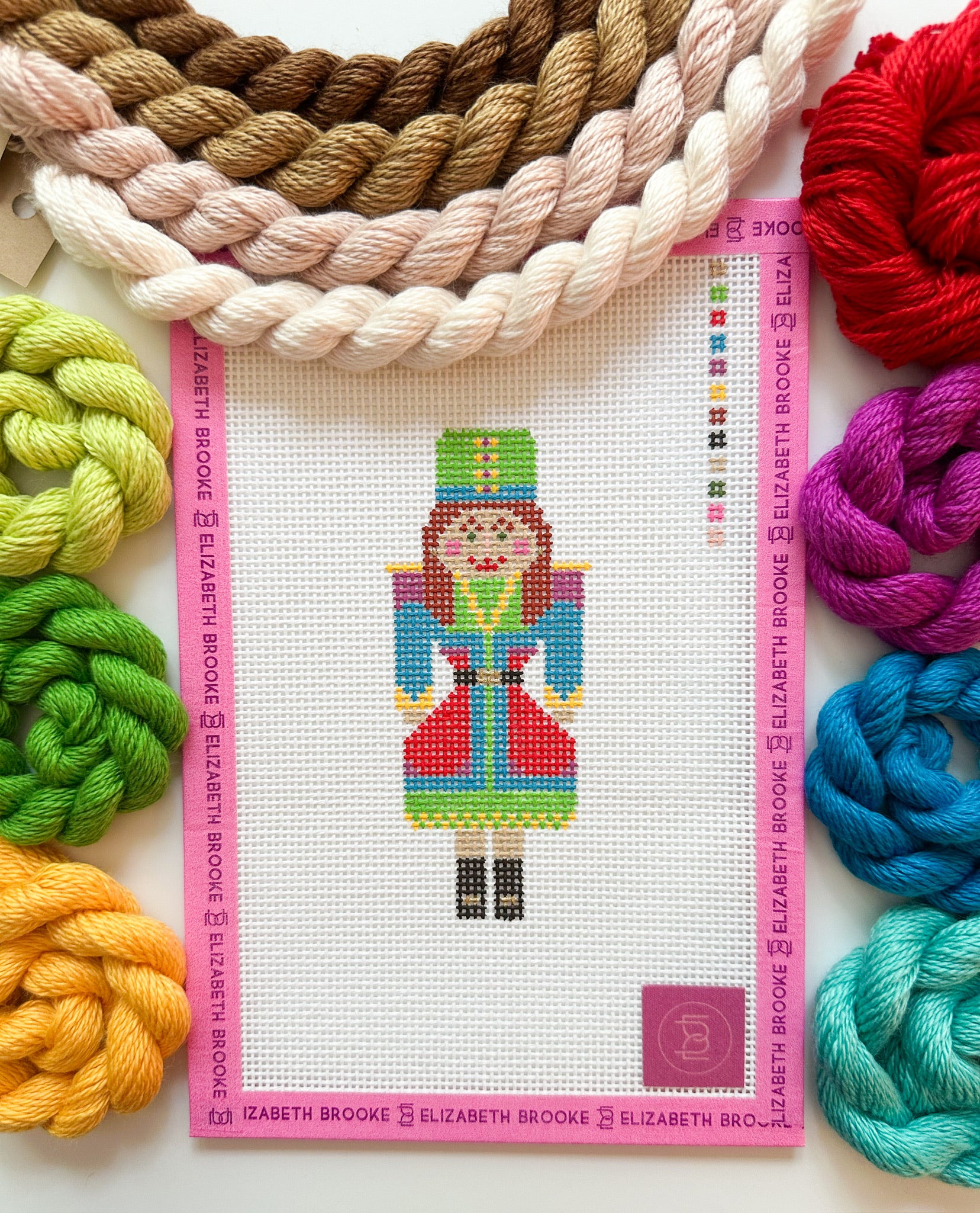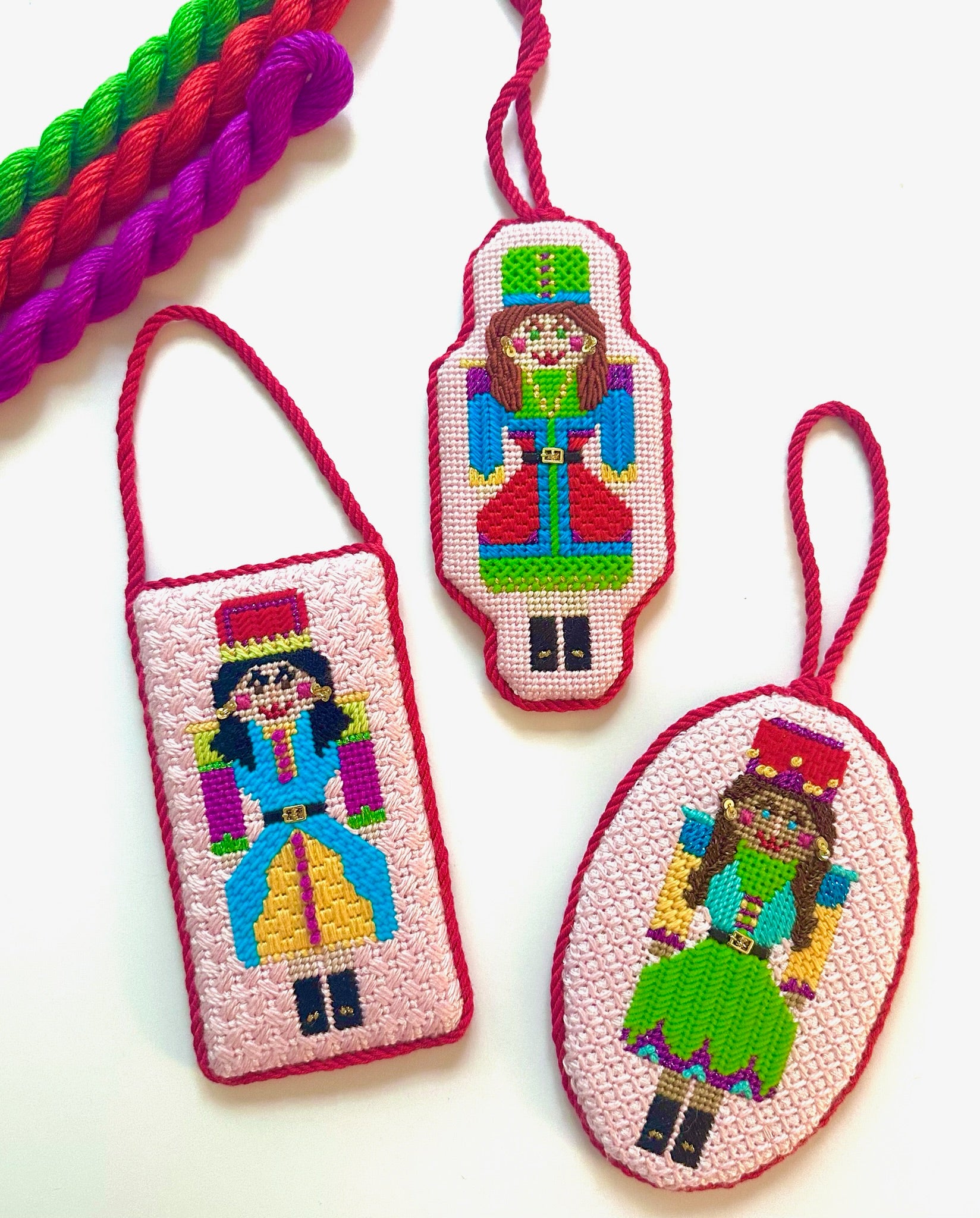 Our adorable 2025 holiday collection is 5 female nutcrackers that we call our "Nutty ladies." Available in two festive colorways: holiday brights and classic jewels. These ladies are designed with a neutral medium skin color that easily accommodates any skin tone from fair to deep - just choose your hair color and its ready for you to personalize! They are a quick stitch on 13 mesh. We love the details in their outfits (and their little earrings!). Each lady measures approximately 2"x5". In a world of male nutcrackers, its time to add some Nutty Ladies to your collection!