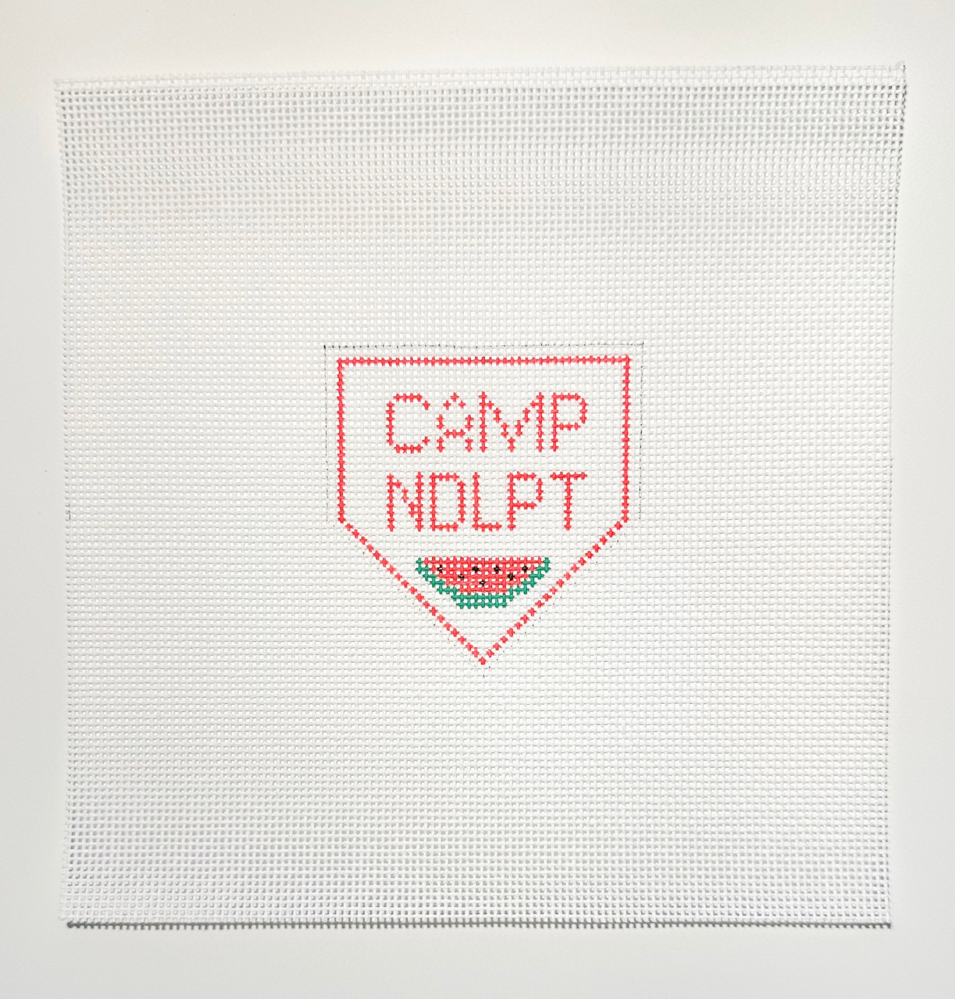 This adorable mini pennant canvas features our Camp NDLPT design in red with a summer watermelon added to the point. Finish with an extra long loop to secure it to your favorite bag handle!